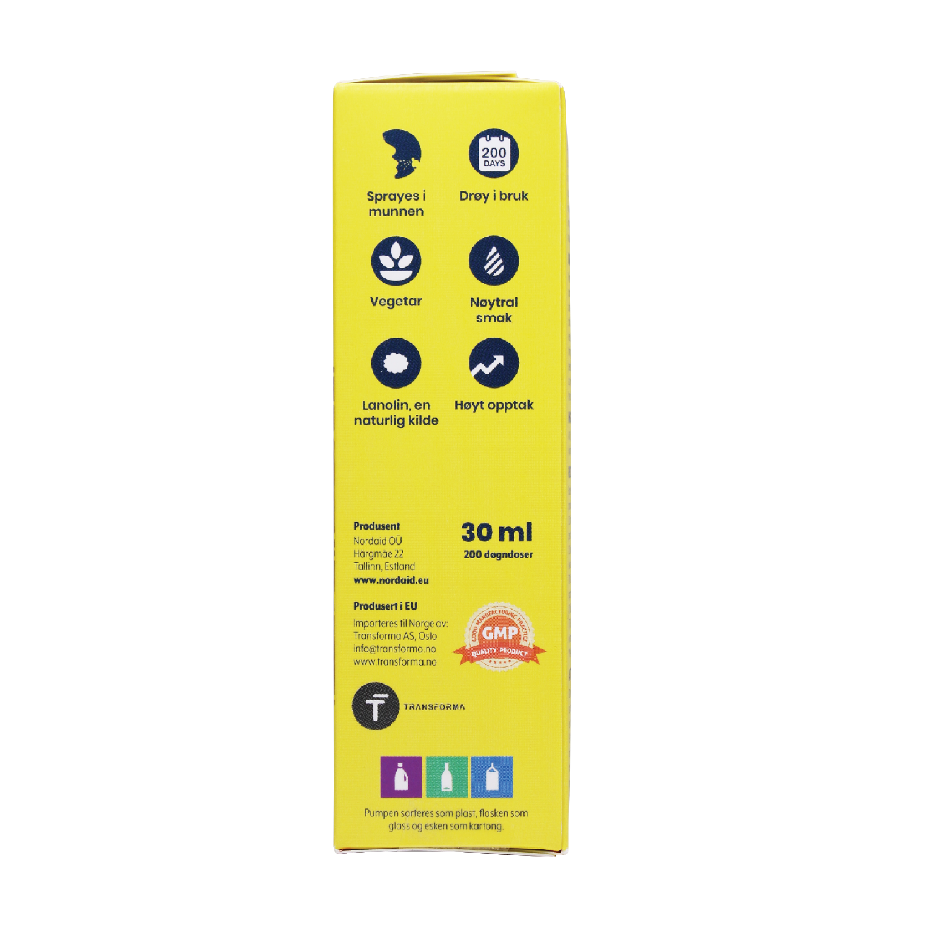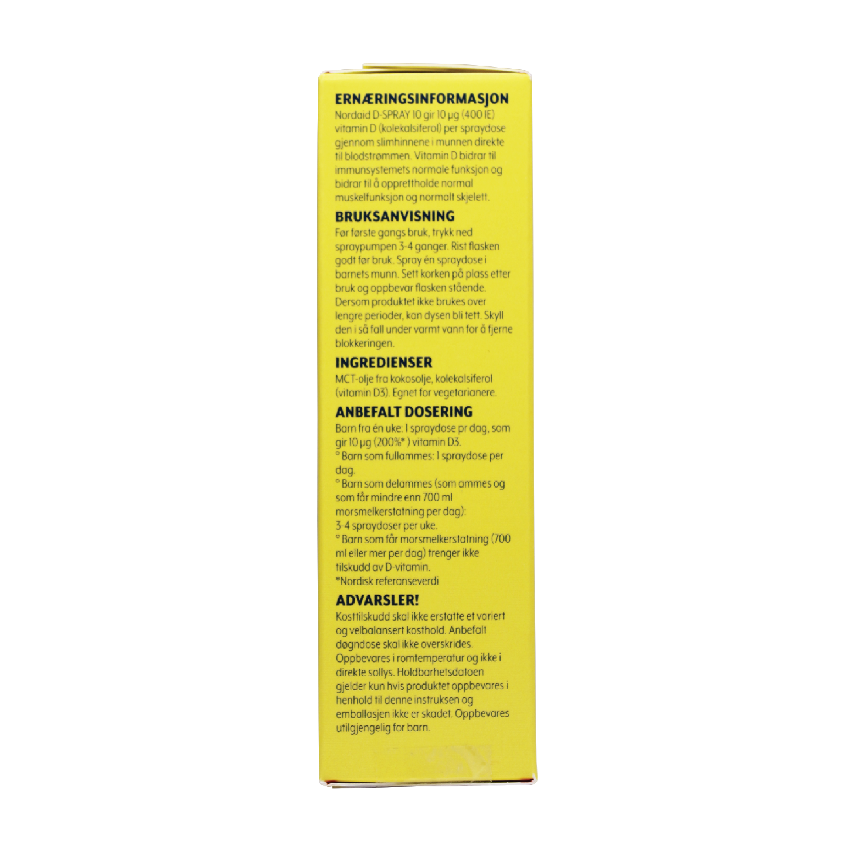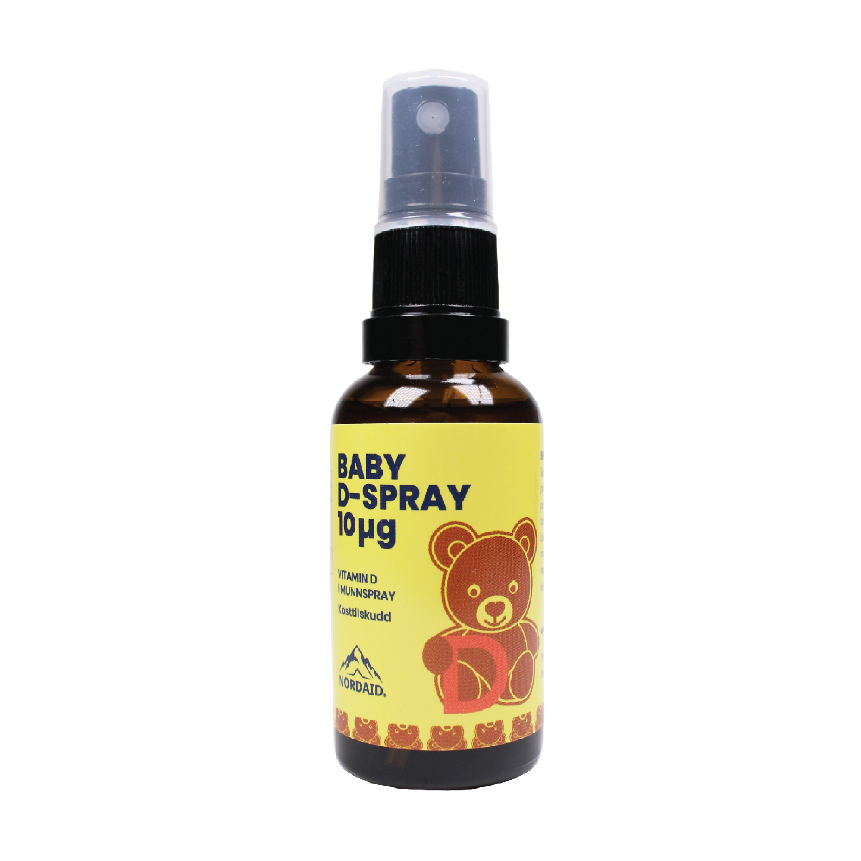 Nordaid D-Spray Baby 10 µg Munnspray er beregnet til spedbarn som fullammes eller delammes, og barn som har behov for ekstra tilskudd av vitamin D. Kan også brukes av andre som ønsker et D-vitaminprodukt i munnspray med nøytral smak. Vitamin D bidrar til å opprettholde normal funksjon av immunforsvaret og musklene, og bidrar til å opprettholde normal muskelfunksjon, normalt skjelett og normale tenner. En spraydose gir 10 mikrogram vitamin D3. Velegnet for vegetarianere da vitaminet stammer fra lanolin. Flasken inneholder 30 ml som er tilsvarende 200 spraydoser.