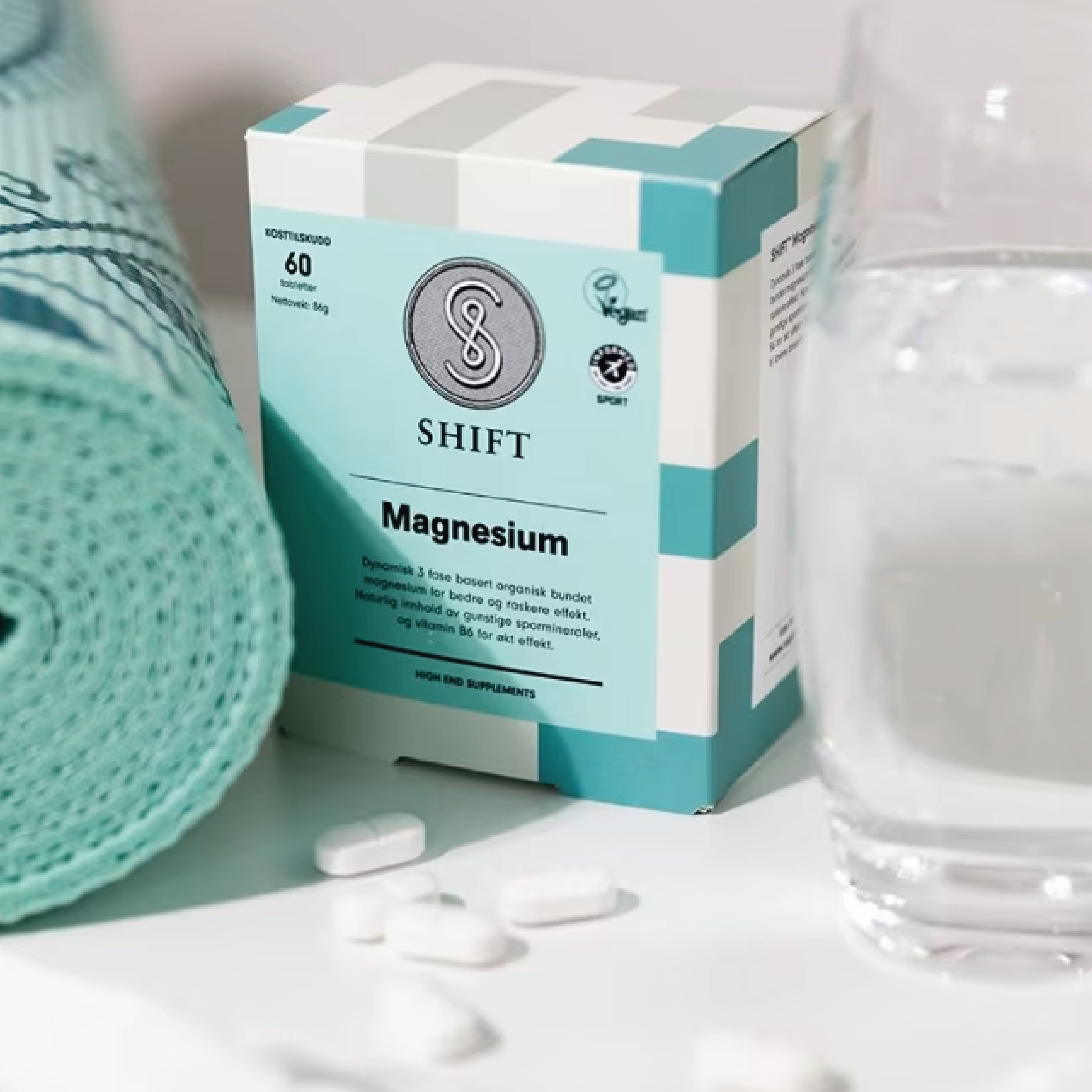 SHIFT Magnesium tabletter inneholder 200 mg magnesium og 2,1 mg vitamin B6. Magnesium bidrar til å opprettholde normale tenner og knokler, normal muskelfunksjon og energiomsetning, redusere tretthet og utmattelse, normal funksjon av nervesystemet, elektrolyttbalansen og normal psykologisk funksjon. Vitamin B6 er tilsatt for økt effekt. SHIFT Magnesium kombinerer magnesium malat, magnesium bisglycinat og Aquamin™ marint magnesium som sammen sikrer et maksimalt og hurtig opptak i kroppen.