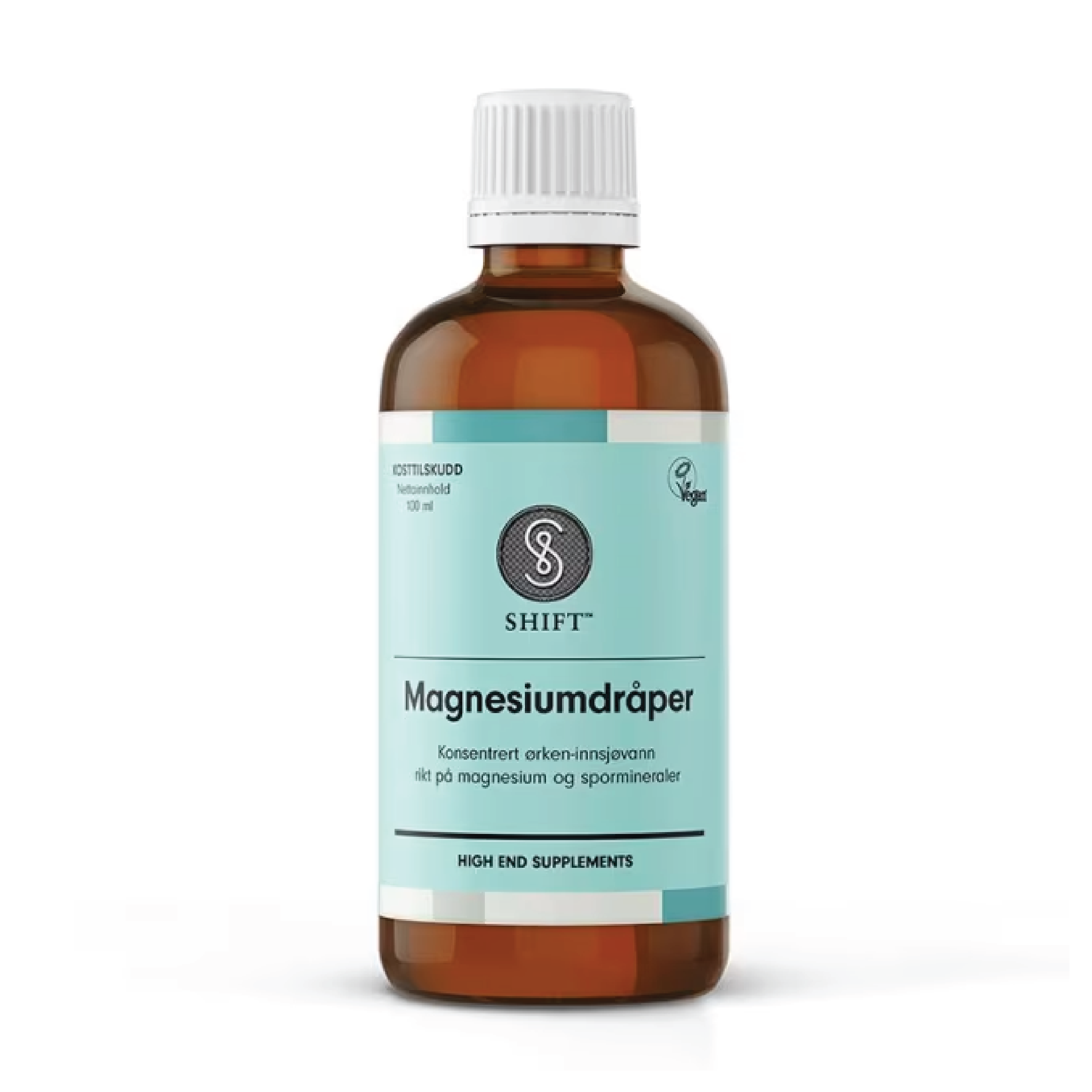 SHIFT Magnesiumdråper inneholder konsentrert ørken-innsjøvann. Dråpene er rike på magnesium og spormineraler som i sin ioniske form har høy biotilgjengelighet. Magnesium bidrar til å redusere tretthet og utmattelse, til normal energiomsetning, psykologisk funksjon og til nervesystemets normale funksjon. Magnesium bidrar også til elektrolyttbalansen, til normal muskelfunksjon og til å opprettholde normale tenner og knokler.