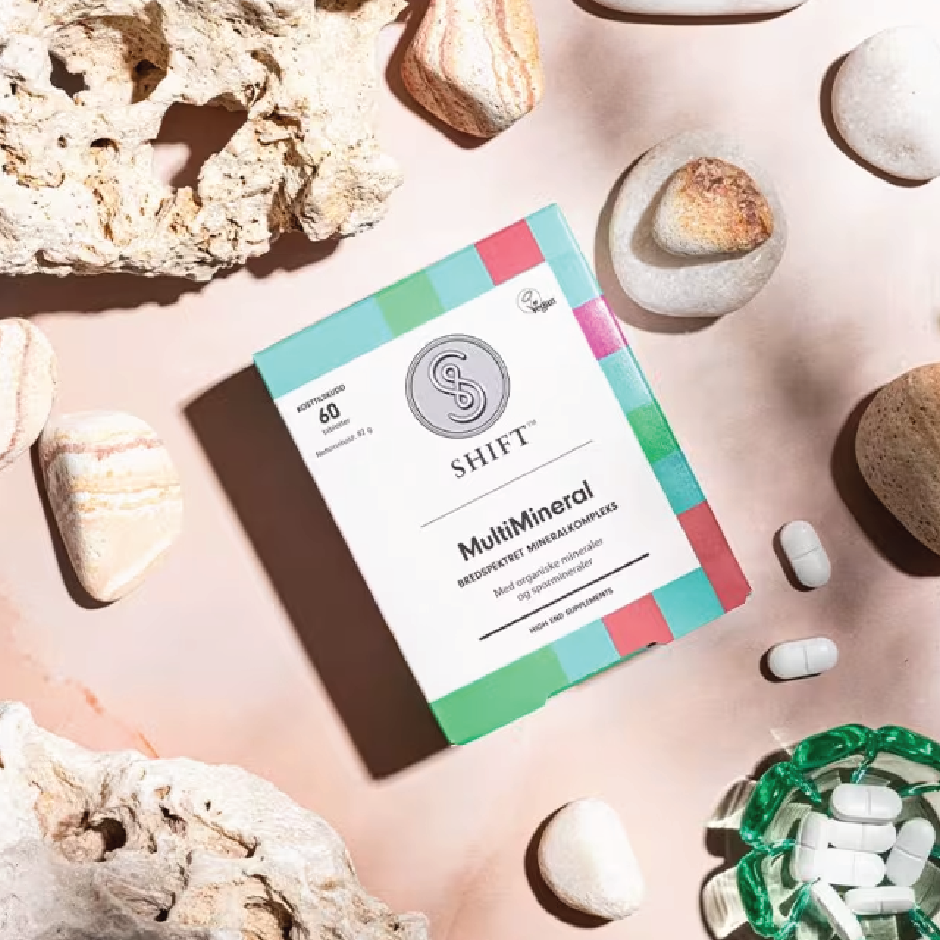 SHIFT MultiMineral tabletter inneholder magnesium, sink, mangan, kobber, jod, selen, molybden og krom. Magnesium bidrar til normal muskelfunksjon og nervesystemets normale funksjon. Sink bidrar til immunsystemets normale funksjon. Mangan bidrar til normal energiomsetning. Kobber bidrar til normal transport av jern i kroppen. Jod bidrar til normal produksjon av skjoldbruskhormoner og skjoldbruskkjertelens normale funksjon. Selen bidrar til å beskytte cellene mot oksidativt stress. Molybden bidrar til normal omsetning av svovelaminosyrer. Krom bidrar til å opprettholde normalt blodsukkernivå.