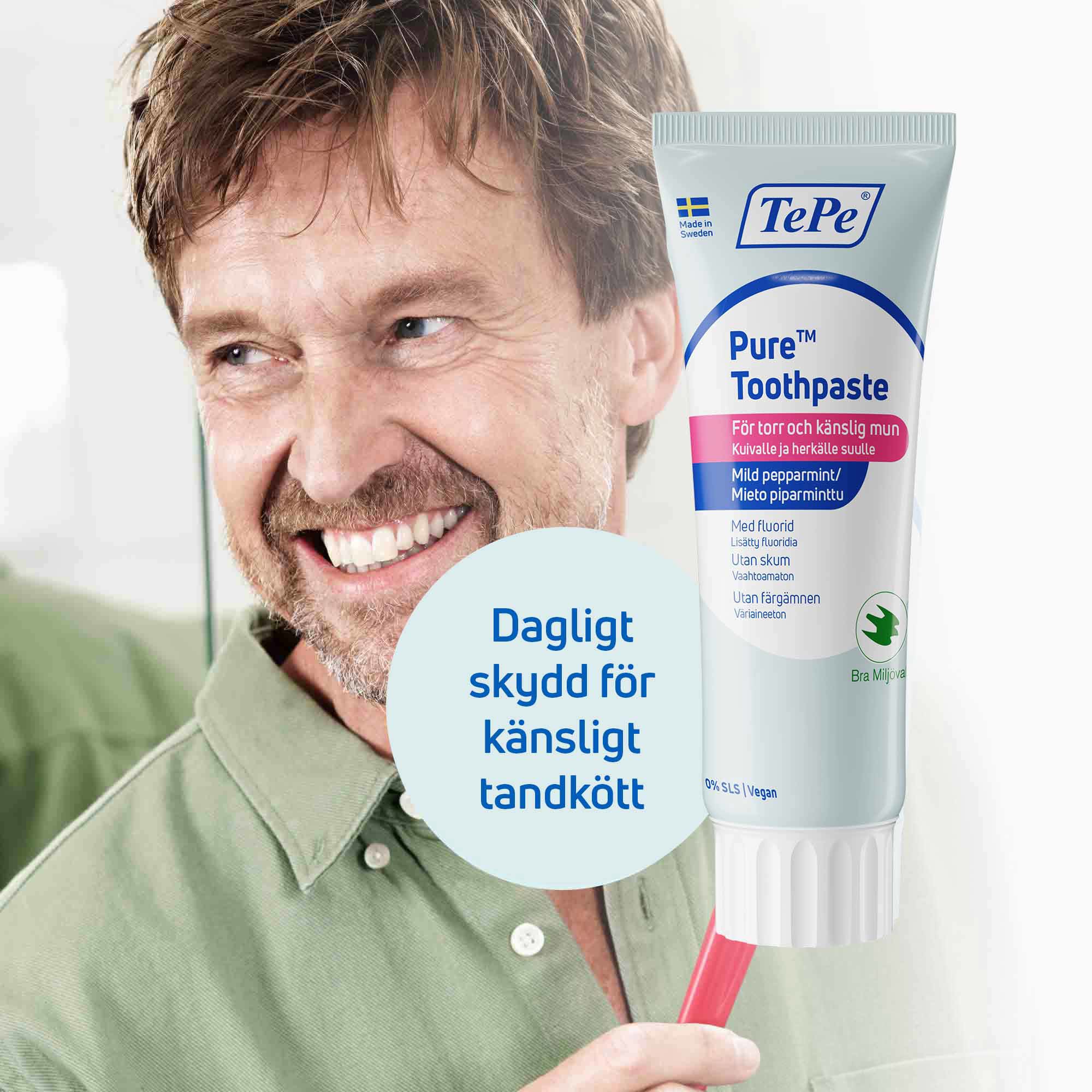 TePe Pure™ Toothpaste er en fluortannkrem tilpasset personer med veldig sensitive munnslimhinner og tørr munn, med smak av mild peppermynte.