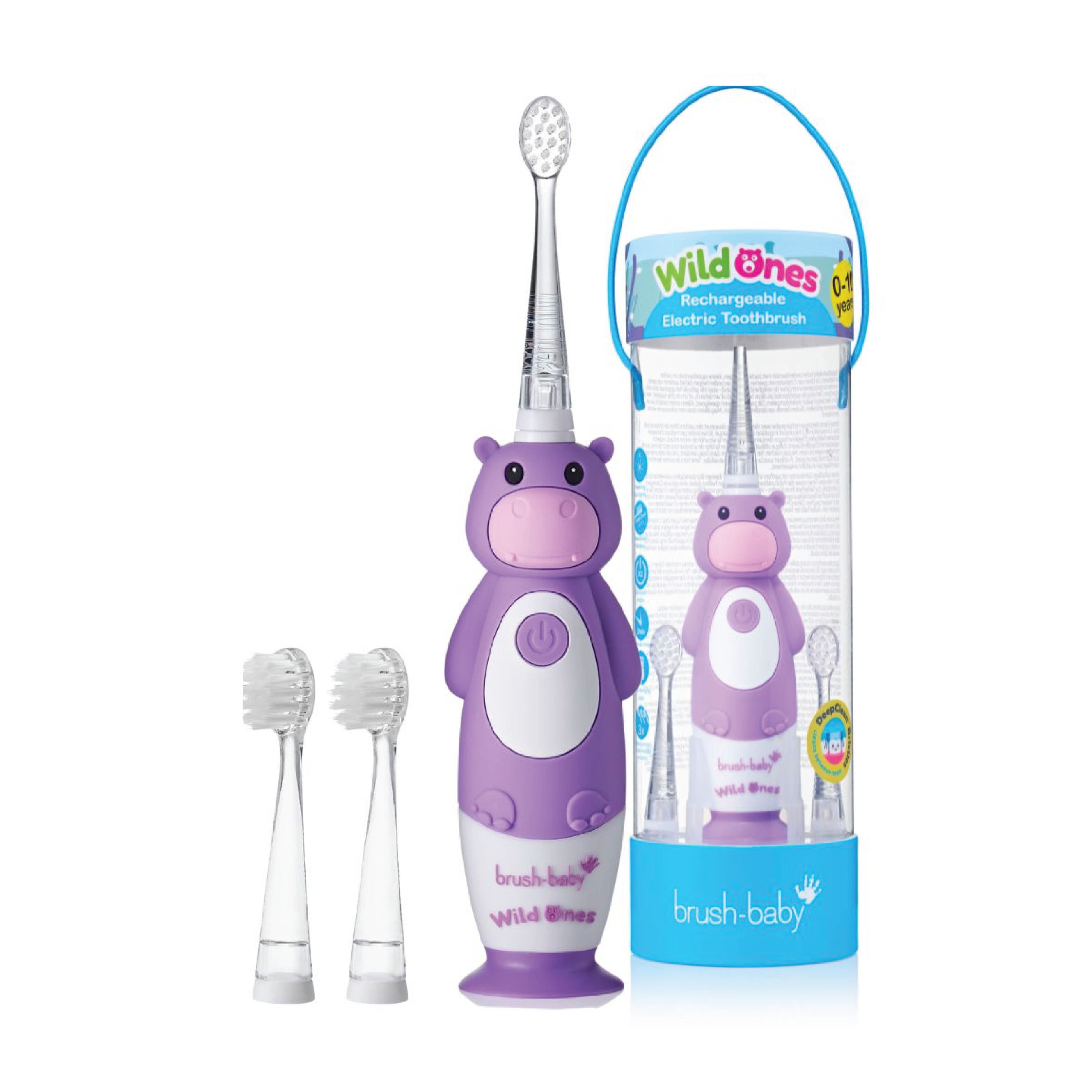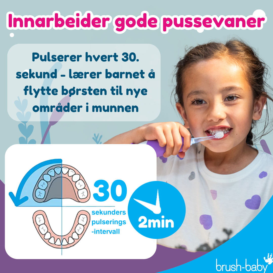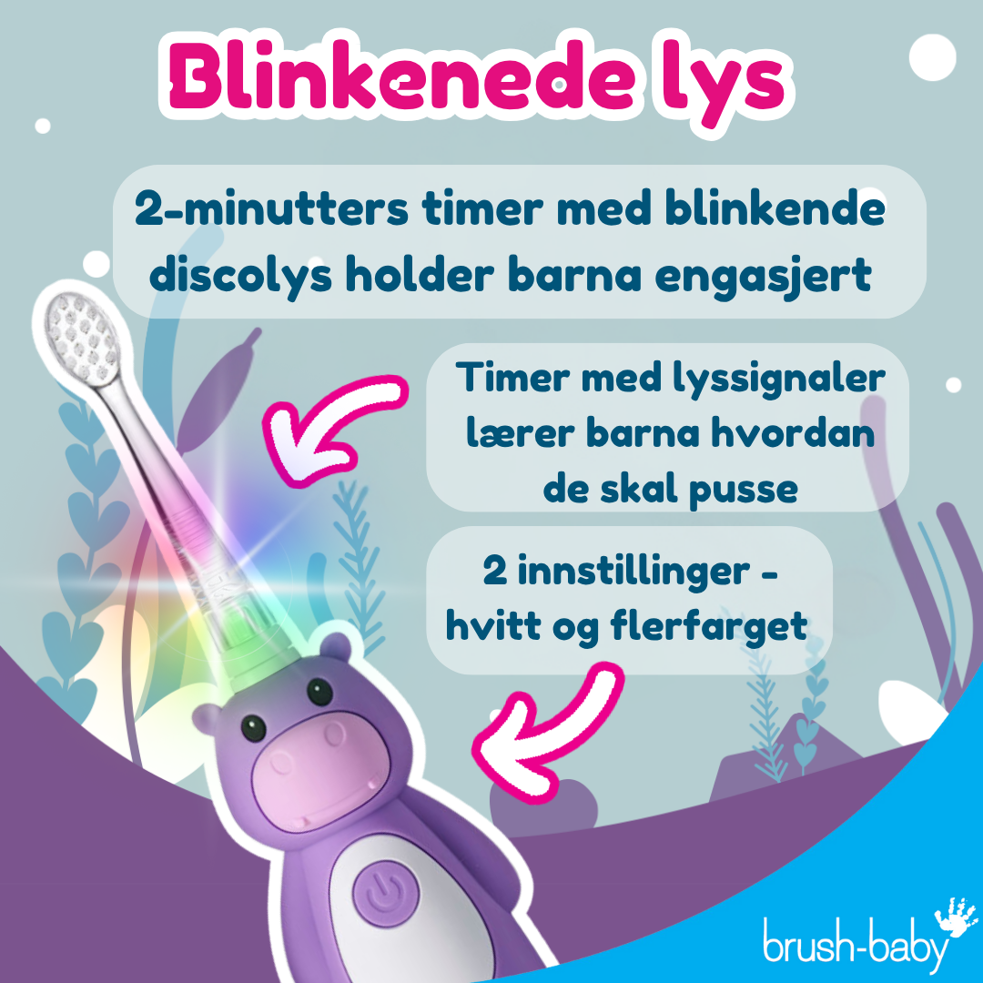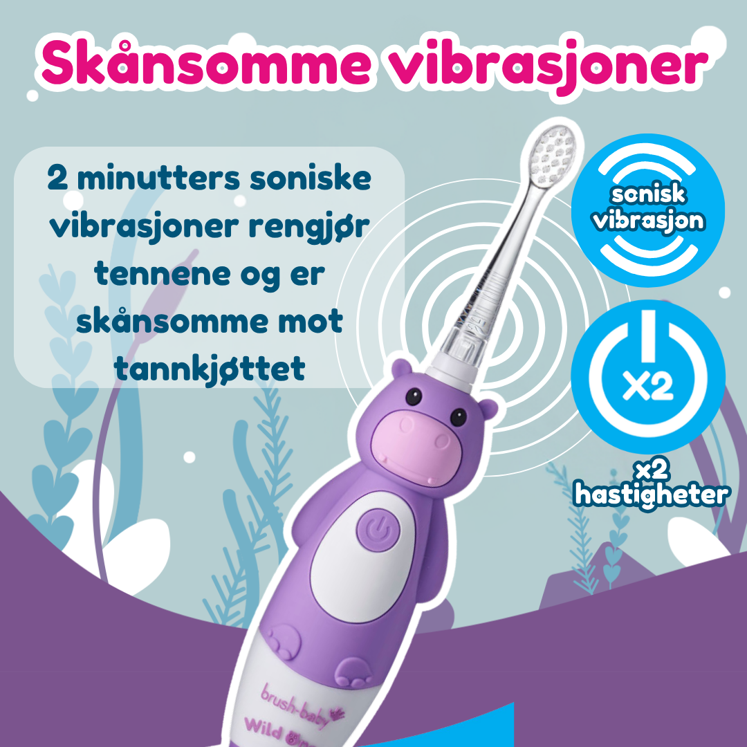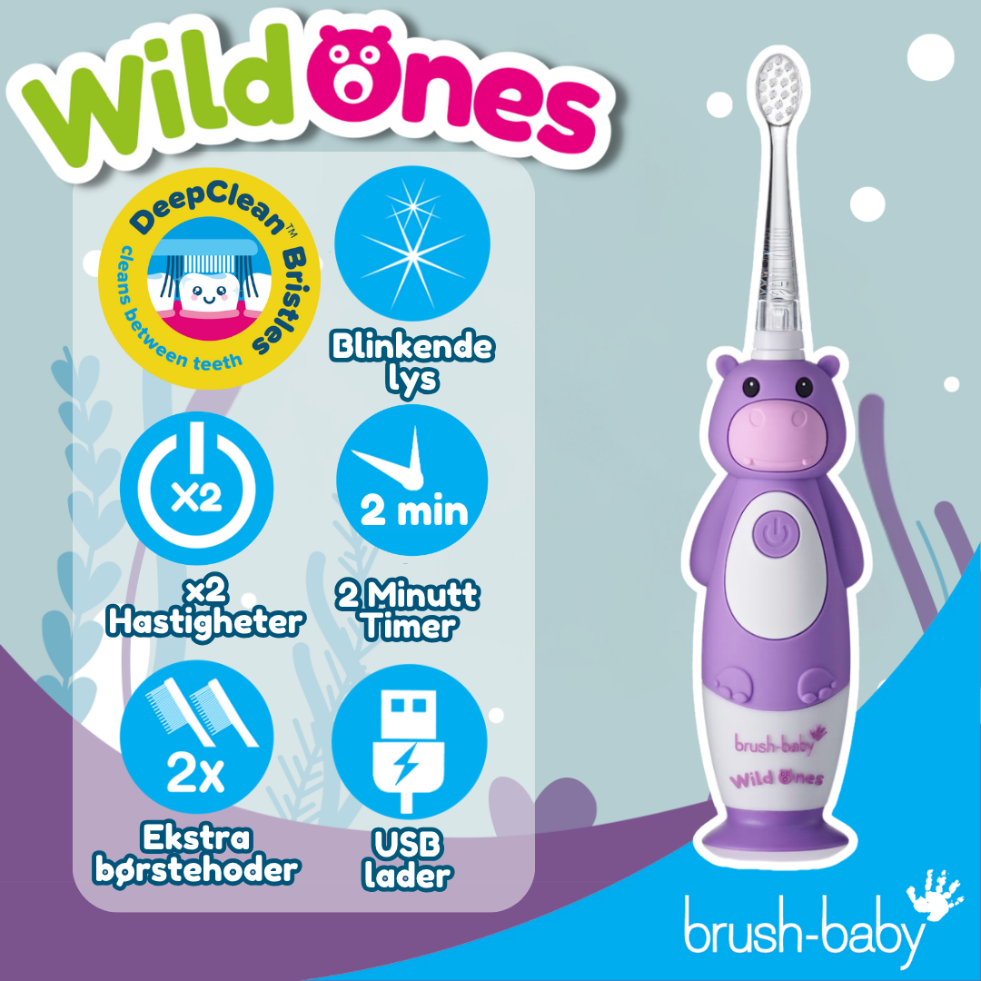 Brush Baby Wildones Oppladbar Elektrisk Tannbørste har et sonisk, mykt børstehode som er skånsomt mot tennene. Tannbørsten har innebygd 2-minutters timer som gjør tannpussen mer motiverende. Den er utformet for å være enkel å holde i små hender, og har en sugekoppfot som gjør at den kan stå stabilt. Tannbørsten er vanntett og leveres med tre børstehoder. Det anbefales å bytte børste hode minst hver 3. måned.