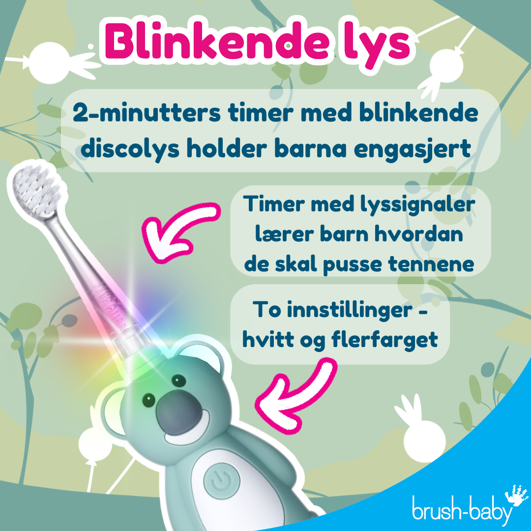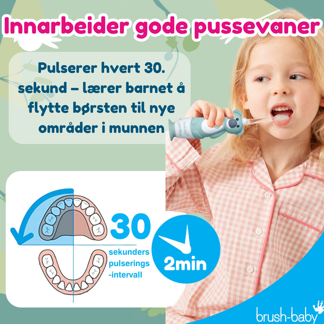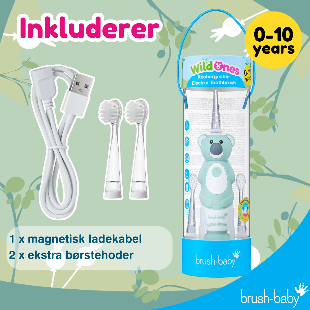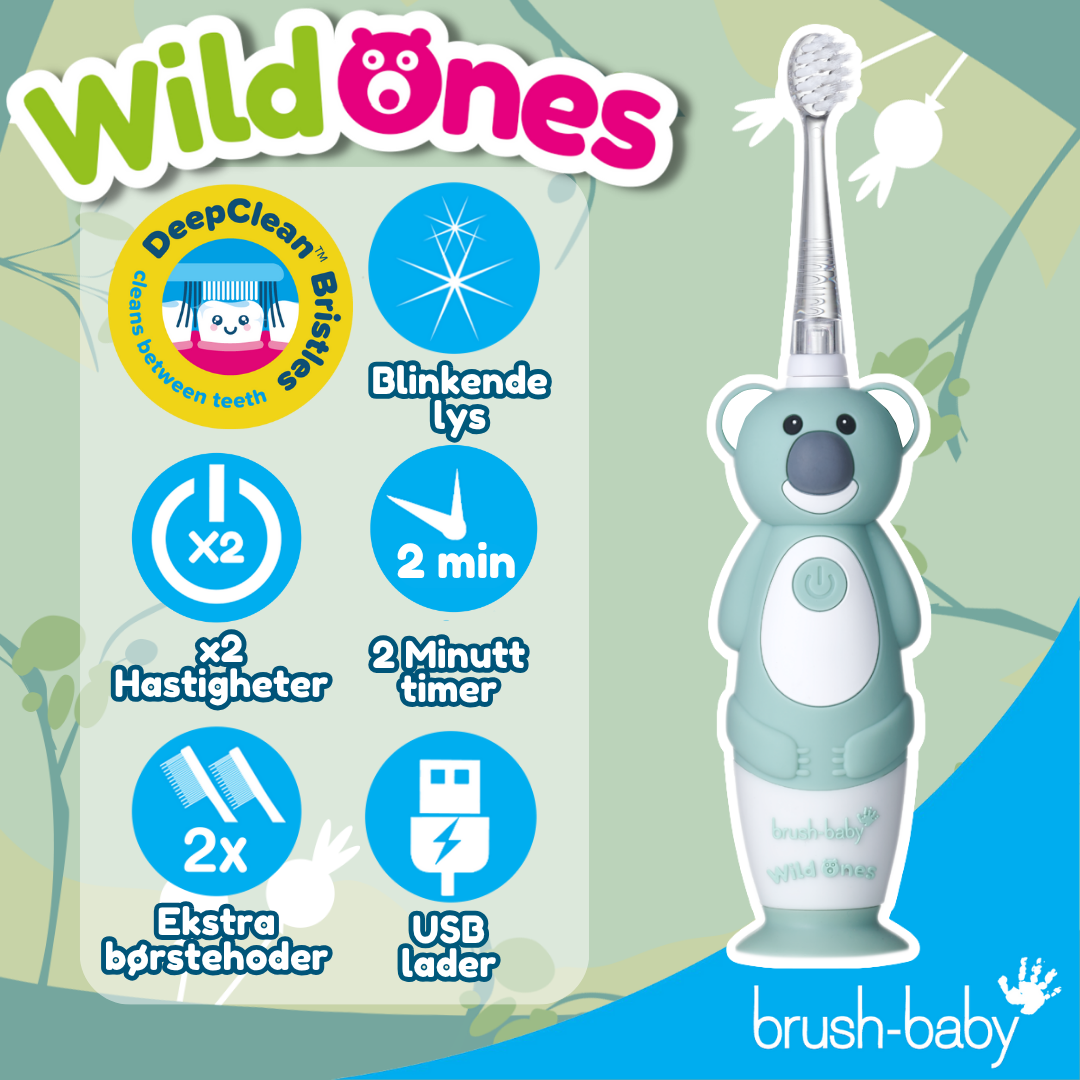 Brush Baby Wildones Oppladbar Elektrisk Tannbørste har et sonisk, mykt børstehode som er skånsomt mot tennene. Tannbørsten har innebygd 2-minutters timer som gjør tannpussen mer motiverende. Den er utformet for å være enkel å holde i små hender, og har en sugekoppfot som gjør at den kan stå stabilt. Tannbørsten er vanntett og leveres med tre børstehoder. Det anbefales å bytte børste hode minst hver 3. måned.