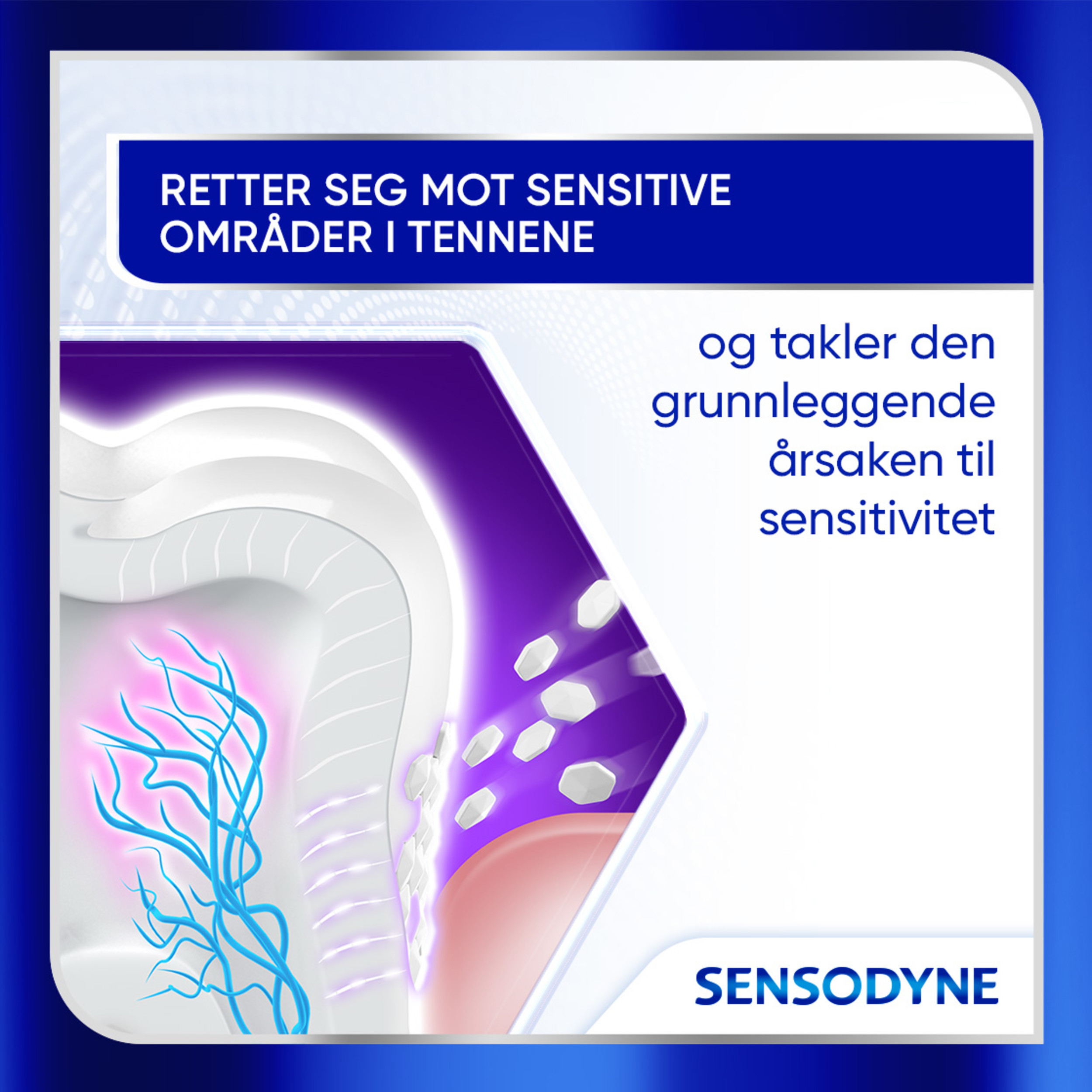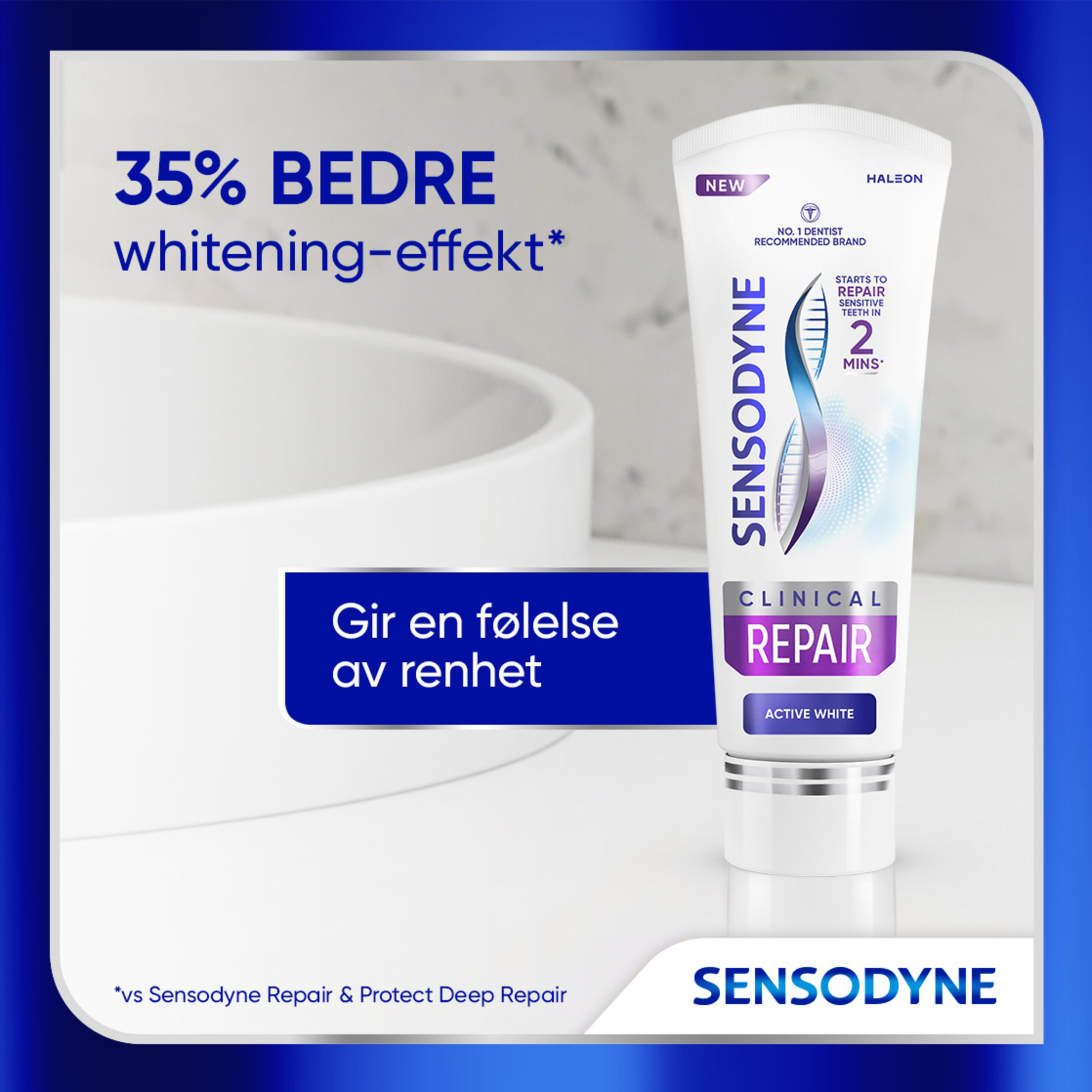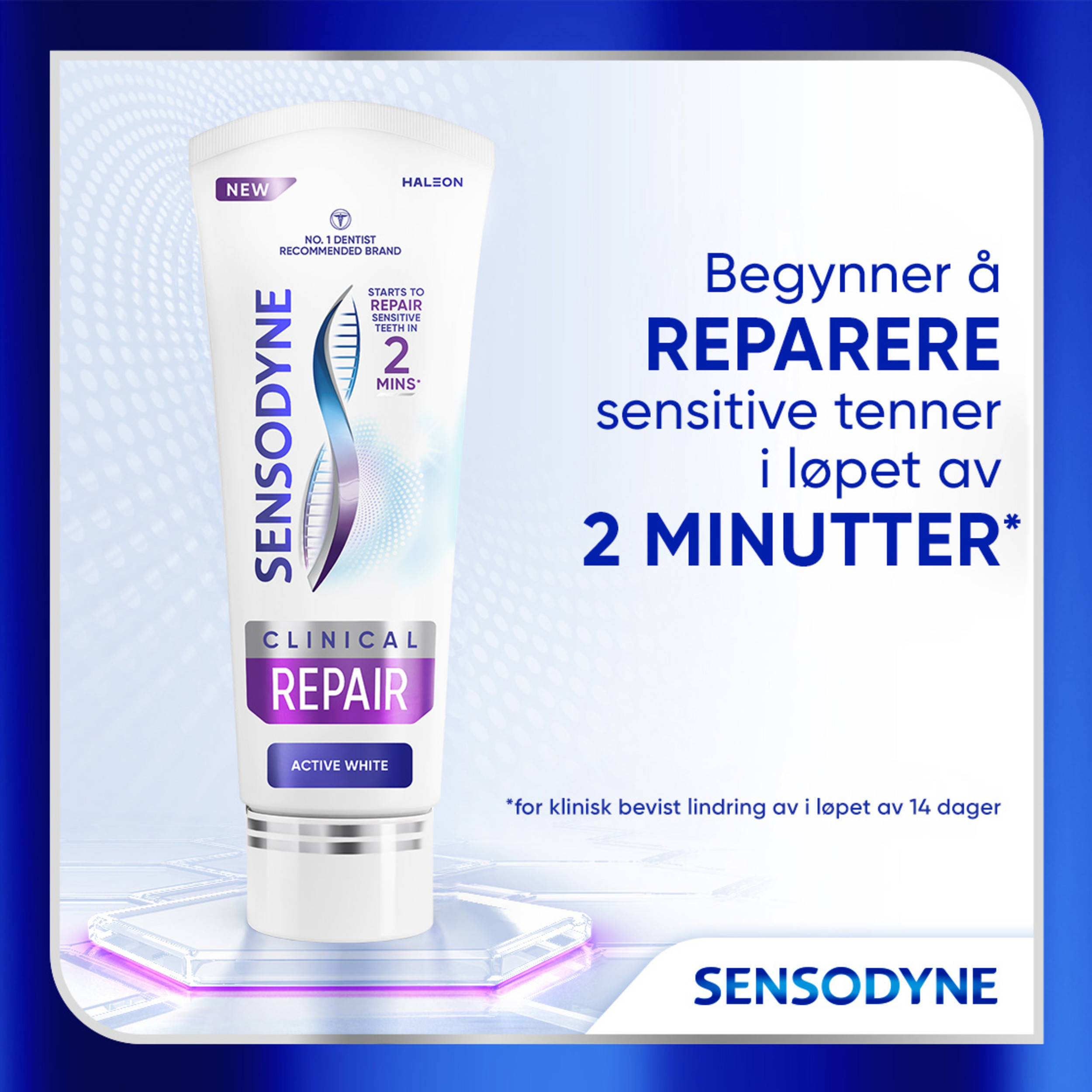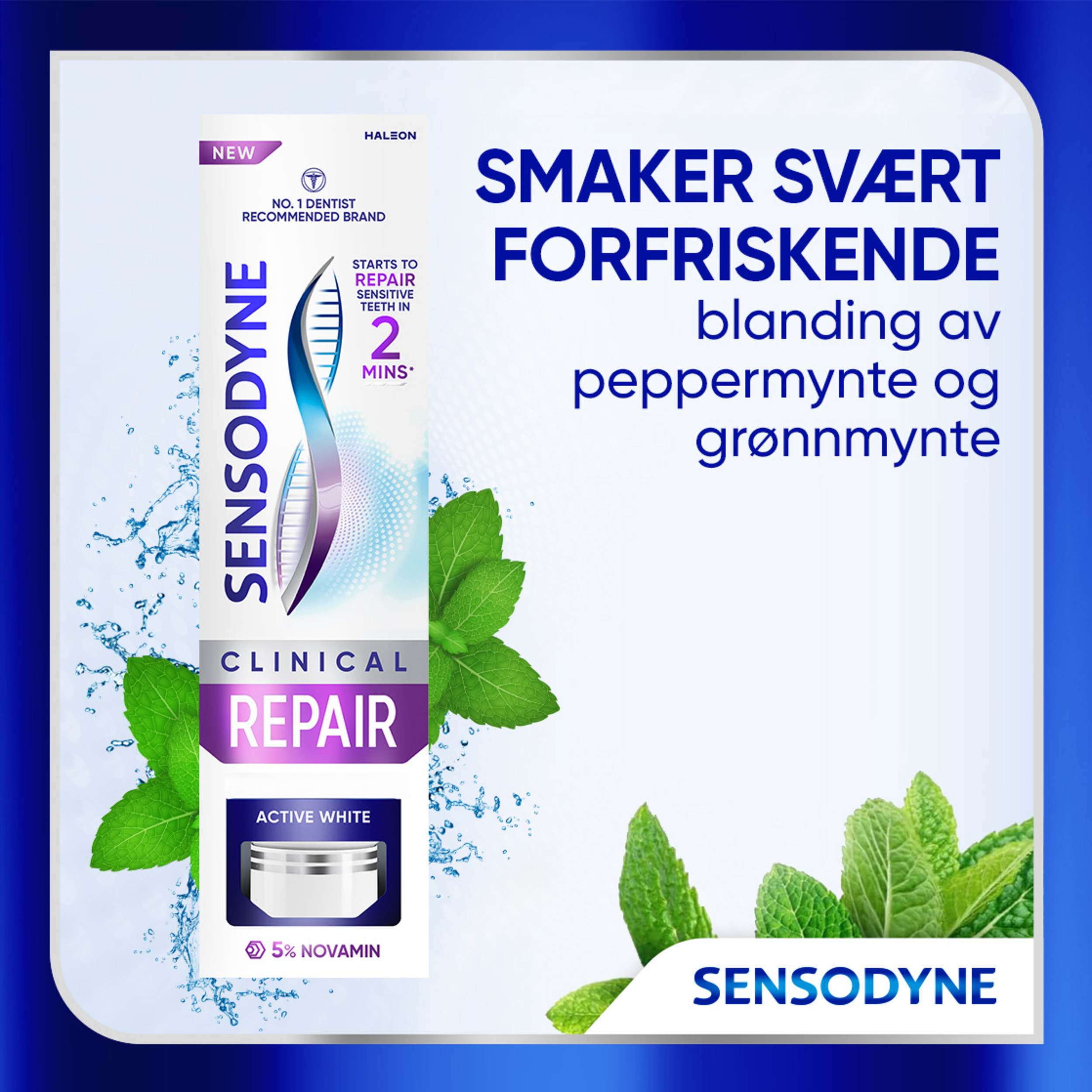Sensodyne Clinical Repair Active White Tannkrem begynner å reparere sensitive tenner i løpet av to minutter og er klinisk bevist å gi langvarig lindring av ising ved kontinuerlig bruk. Tannkremen bidrar til å forhindre at smertene kommer tilbake og gir samtidig en whitening-effekt, samtidig som den er skånsom mot sensitive tenner. Formelen inneholder NovaMin, som bidrar til å gjenoppbygge beskyttelse over sensitive områder, samt ekstra fin perlite og silica for grundig rengjøring. Tannkremen har en rikt skummende geltekstur med en kjølende smak av naturlig peppermynte og grønnmynte som gir en frisk og behagelig følelse ved tannpuss.
