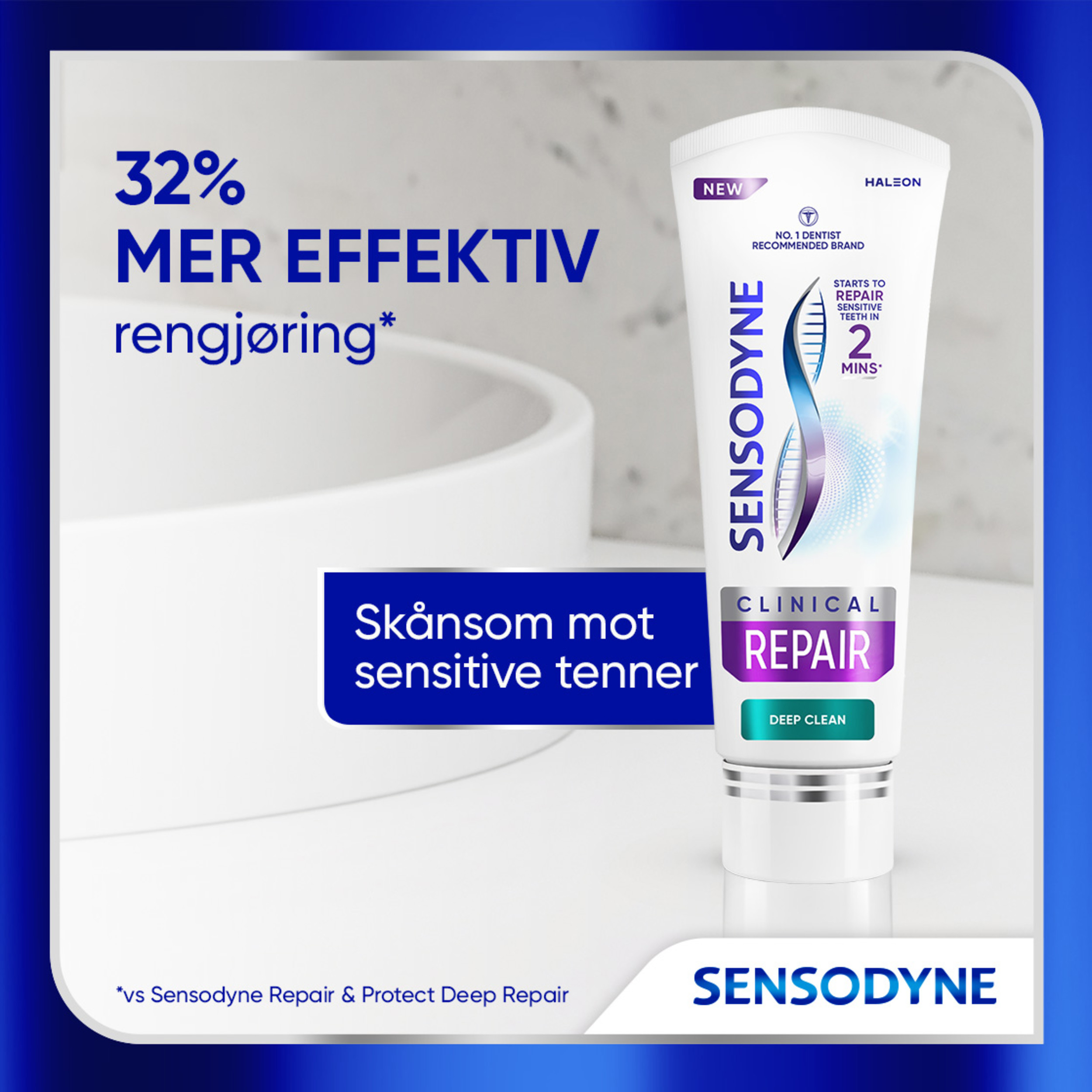 Sensodyne Clinical Repair Deep Clean Tannkrem begynner å reparere sensitive tenner i løpet av to minutter og er klinisk bevist å gi langvarig lindring av ising ved kontinuerlig bruk. Tannkremen bidrar til å forhindre at smertene kommer tilbake og gir samtidig effektiv rengjøring, samtidig som den er skånsom mot sensitive tenner. Tannkremen inneholder NovaMin, som bidrar til å gjenoppbygge beskyttelse over sensitive områder, samt ekstra fin Perlite for grundig rengjøring. Den har en rikt skummende geltekstur med en forfriskende smak av naturlig peppermynte og eukalyptus som gir en behagelig, kjølende følelse ved tannpuss.