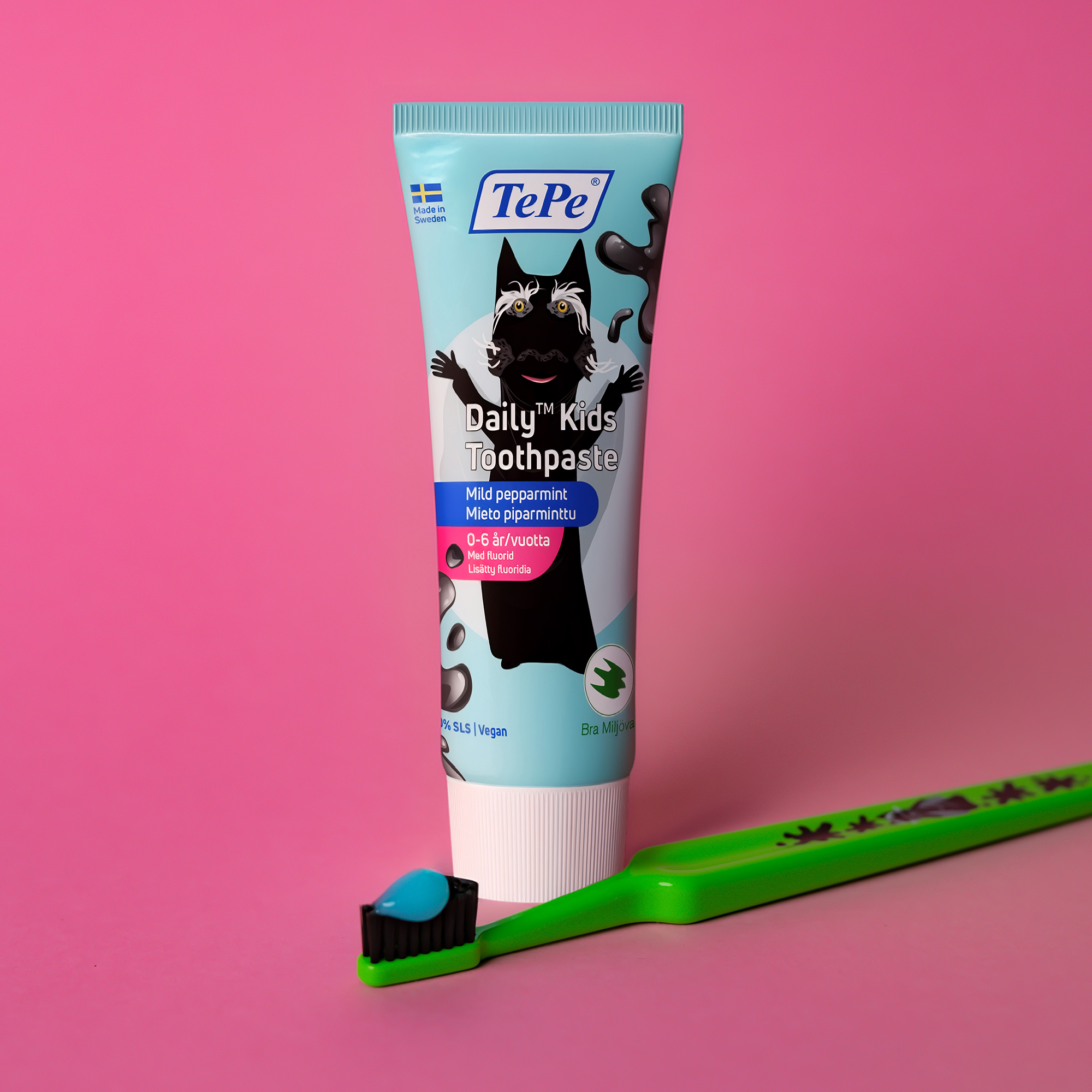 TePe Daily™ Kids Toothpaste Sommarskuggan er en skånsom fluortannkrem med Sommerskuggan-motiver, til barn fra mellom 0-6 år.
