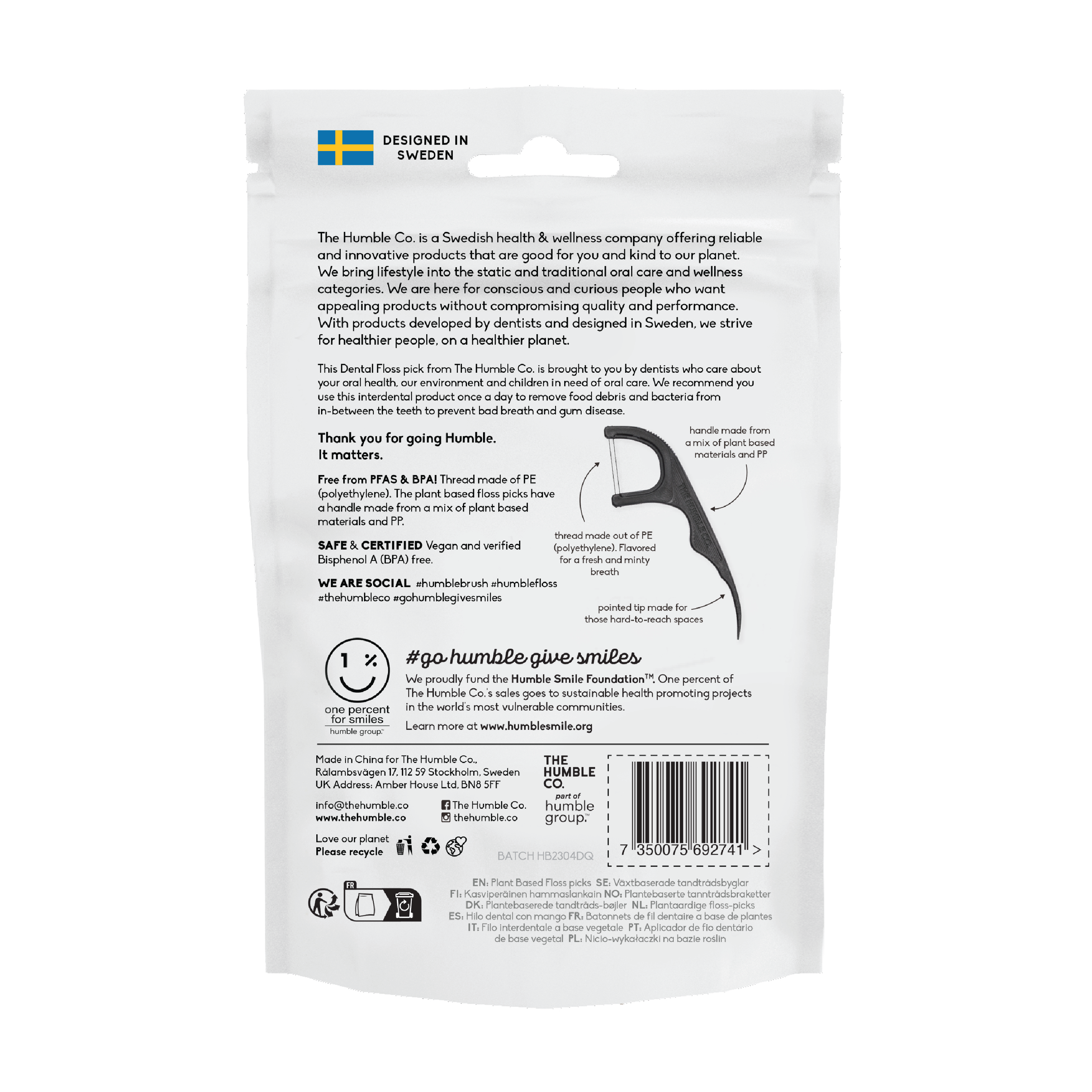 The Humble Co. Floss Picks Charcoal Tanntrådbøyle har en sterk tanntråd med aktivt kull som effektivt fjerner matrester og rengjør mellom tennene, og et ergonomisk skaft som gjør det enklere å nå vanskelige områder. Tanntrådbøylen er laget hovedsakelig av maisstivelse og pakket i miljøvennlig emballasje, for å redusere belastningen på miljøet samtidig som de gir en enkel og effektiv rengjøring.