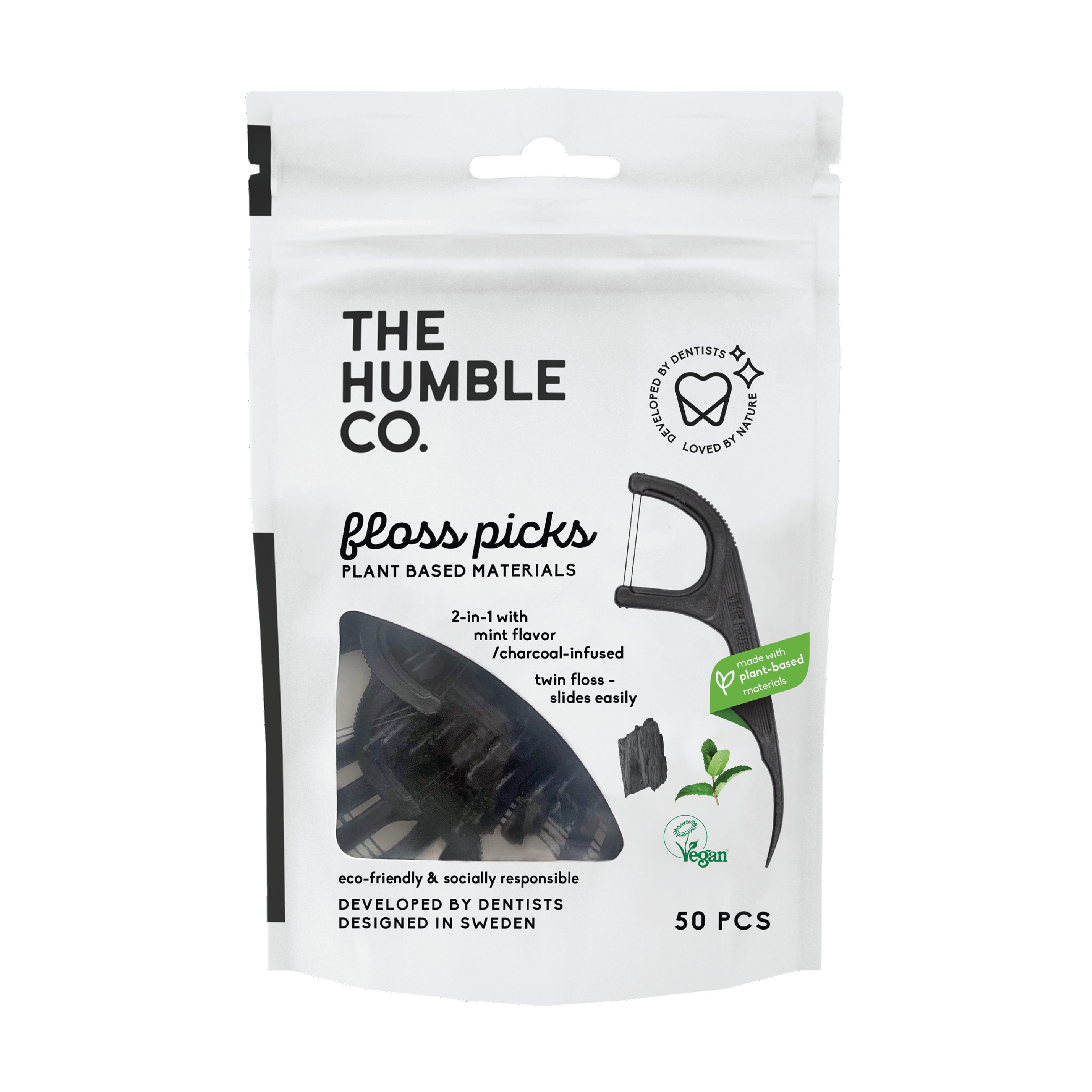 The Humble Co. Dental Floss Charcoal Grip Picks er en tanntrådbøyle med aktivt kull som gjør tannrensen til en lek, med mintsmak.