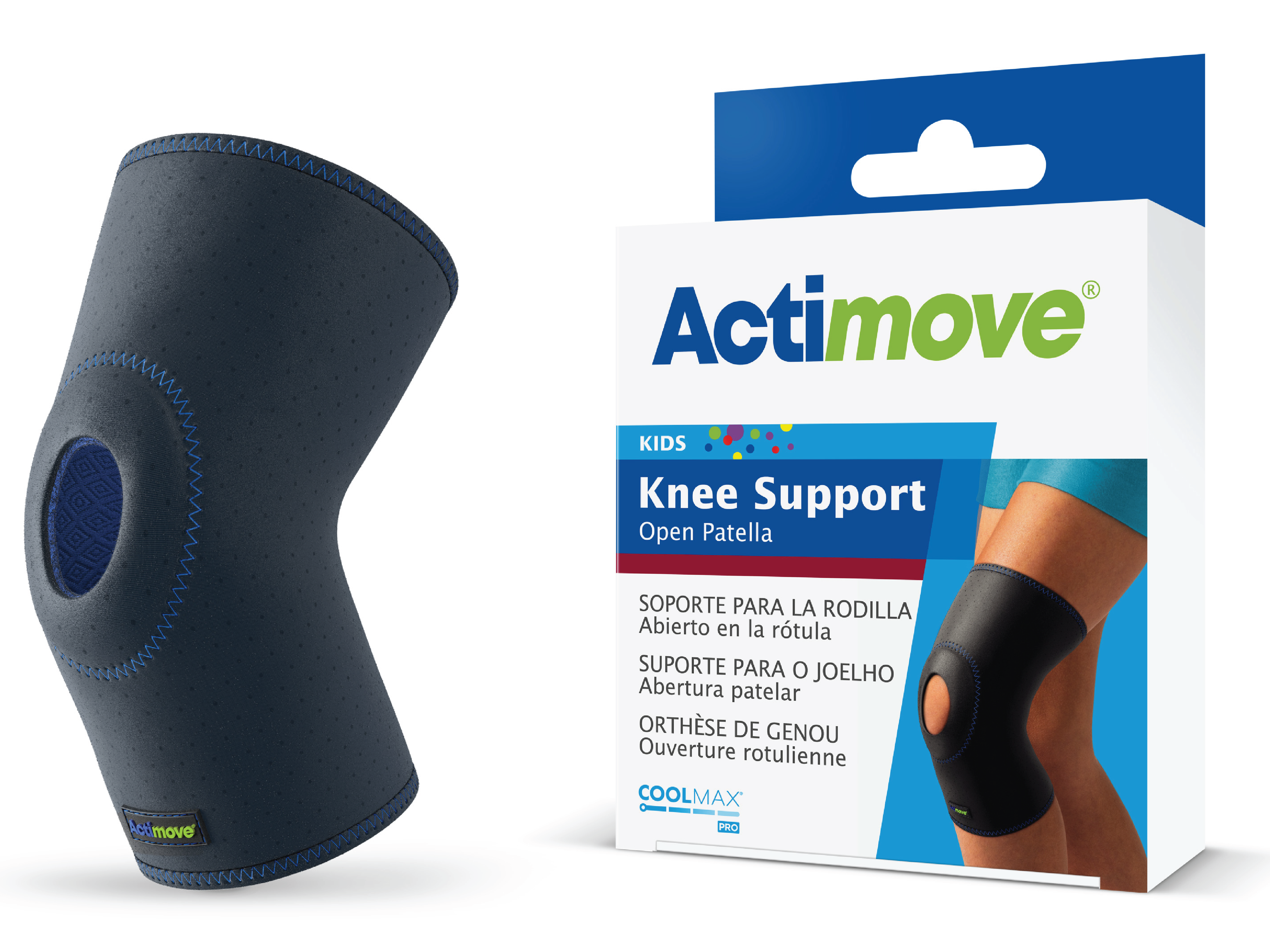 Actimove Kids Knestøtte Barn bidrar til å lindre smerte, reduserer hevelser og fremskynder helning gjennom balansert varme og medisinsk kompresjon. Trykket på kneskålen minskes gjennom den åpne utformingen. Knestøtten har en kroppsnær passform som holder den på plass, og gir støtte og stabilitet. Produsert i latexfritt, hudvennlig og pustende neoprenfritt materiale med COOLMAX® AIR-teknologi. Rask og enkel slip-on-design.