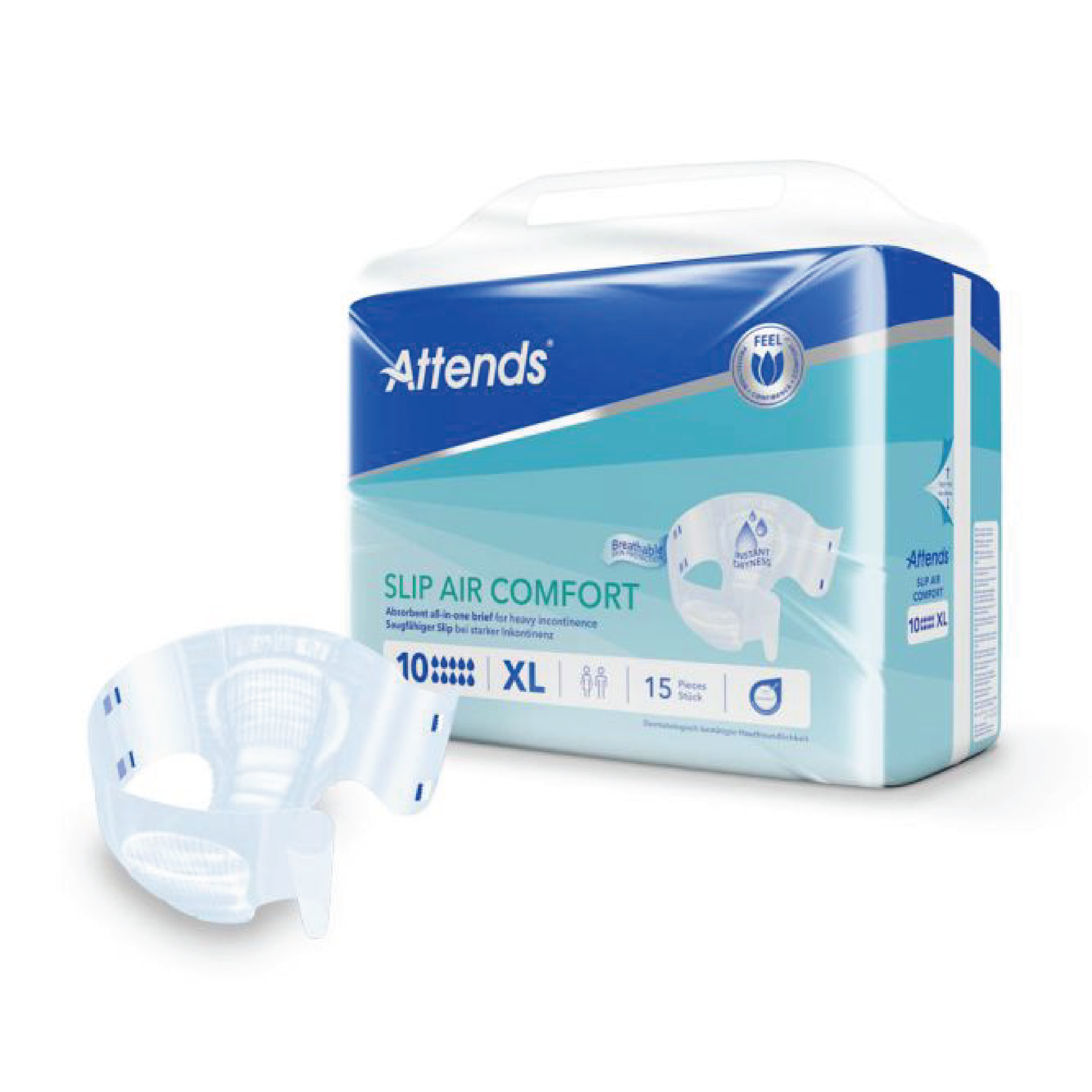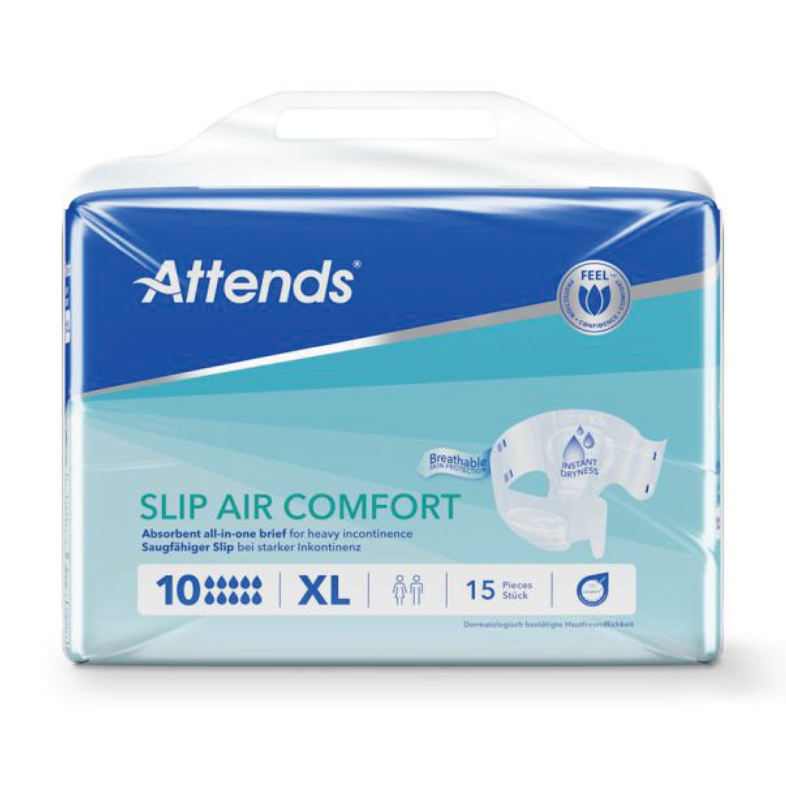 Attends Slip Air Comfort 10 er utstyrt med kanalteknologi som bidrar til rask fordeling av væske, trekker fuktighet bort fra huden og gir en tørrere overflate. Den pustende baksiden bidrar til å beskytte huden, mens elastisk midjebånd, benelastikker og anatomisk formet kjerne gir god passform og komfort. Produktet har et festesystem med fire gjenlukkbare teiper som gjør det enkelt å tilpasse bleien etter behov. Den superabsorberende kjernen med distribusjonslag og luktbeskyttelse bidrar til økt tørrhet og redusert risiko for ubehagelig lukt. Passer for kvinner og menn med liten eller ingen kontroll på blære- og/eller tarmfunksjon.