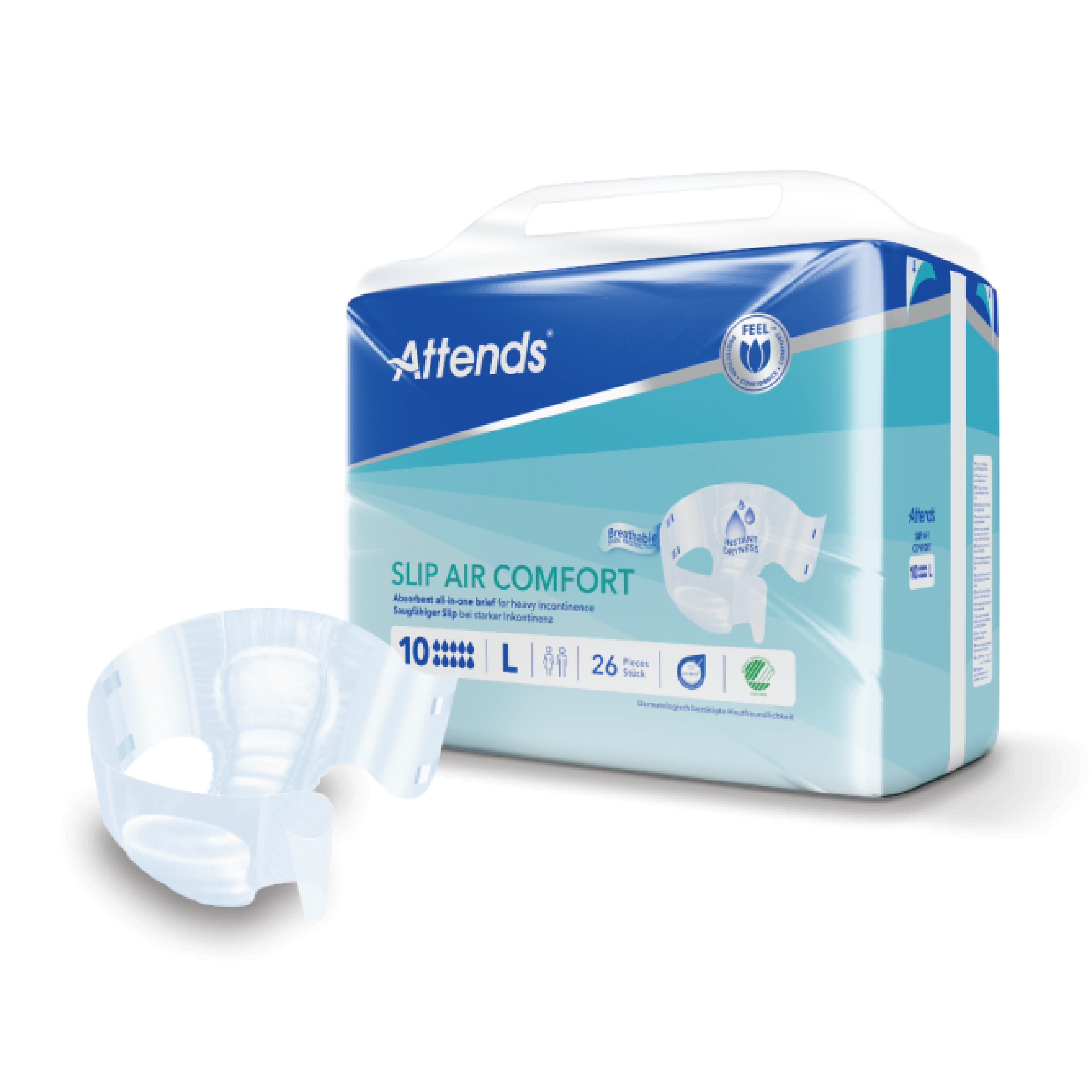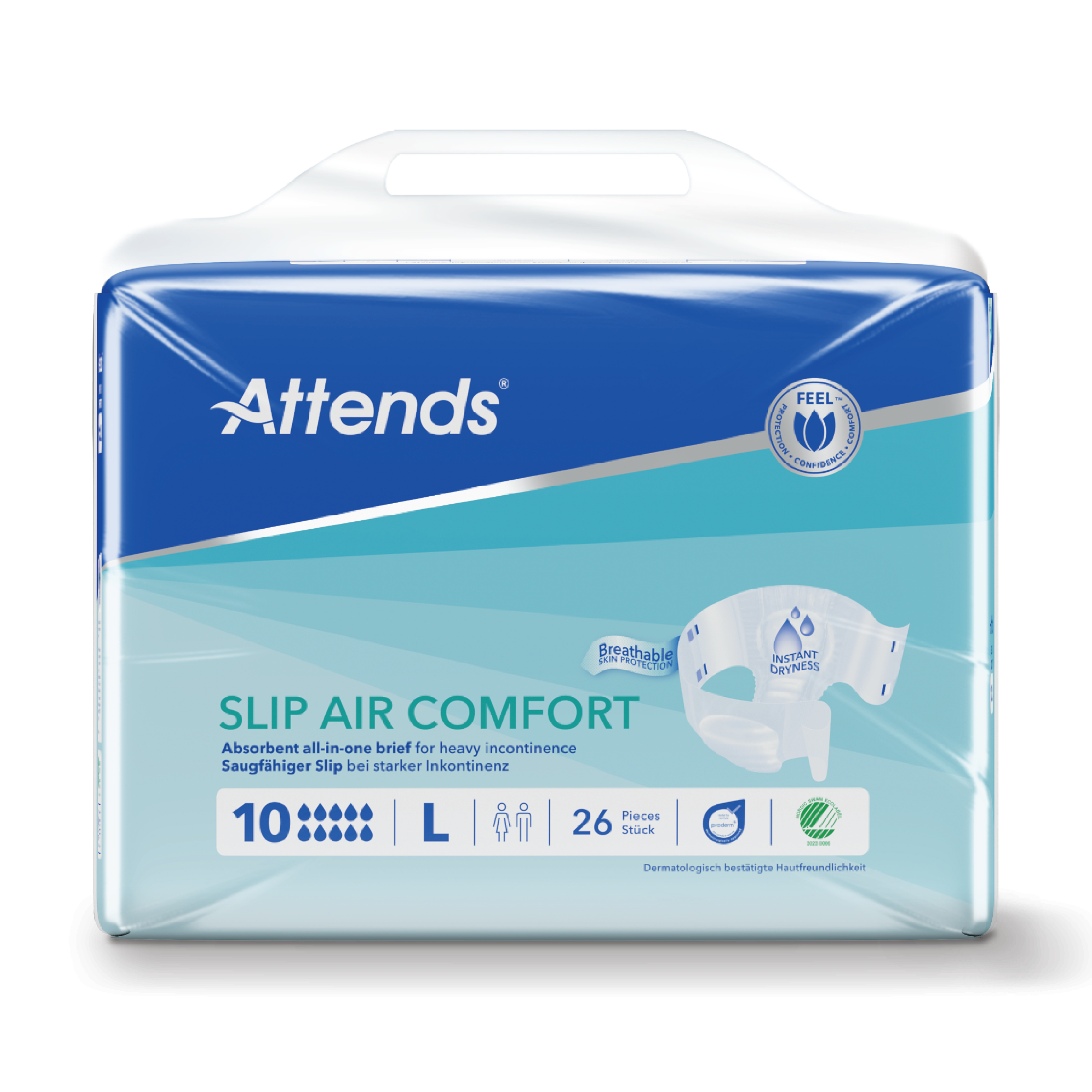 Attends Slip Air Comfort 10 er utstyrt med kanalteknologi som bidrar til rask fordeling av væske, trekker fuktighet bort fra huden og gir en tørrere overflate. Den pustende baksiden bidrar til å beskytte huden, mens elastisk midjebånd, benelastikker og anatomisk formet kjerne gir god passform og komfort. Produktet har et festesystem med fire gjenlukkbare teiper som gjør det enkelt å tilpasse bleien etter behov. Den superabsorberende kjernen med distribusjonslag og luktbeskyttelse bidrar til økt tørrhet og redusert risiko for ubehagelig lukt. Passer for kvinner og menn med liten eller ingen kontroll på blære- og/eller tarmfunksjon.