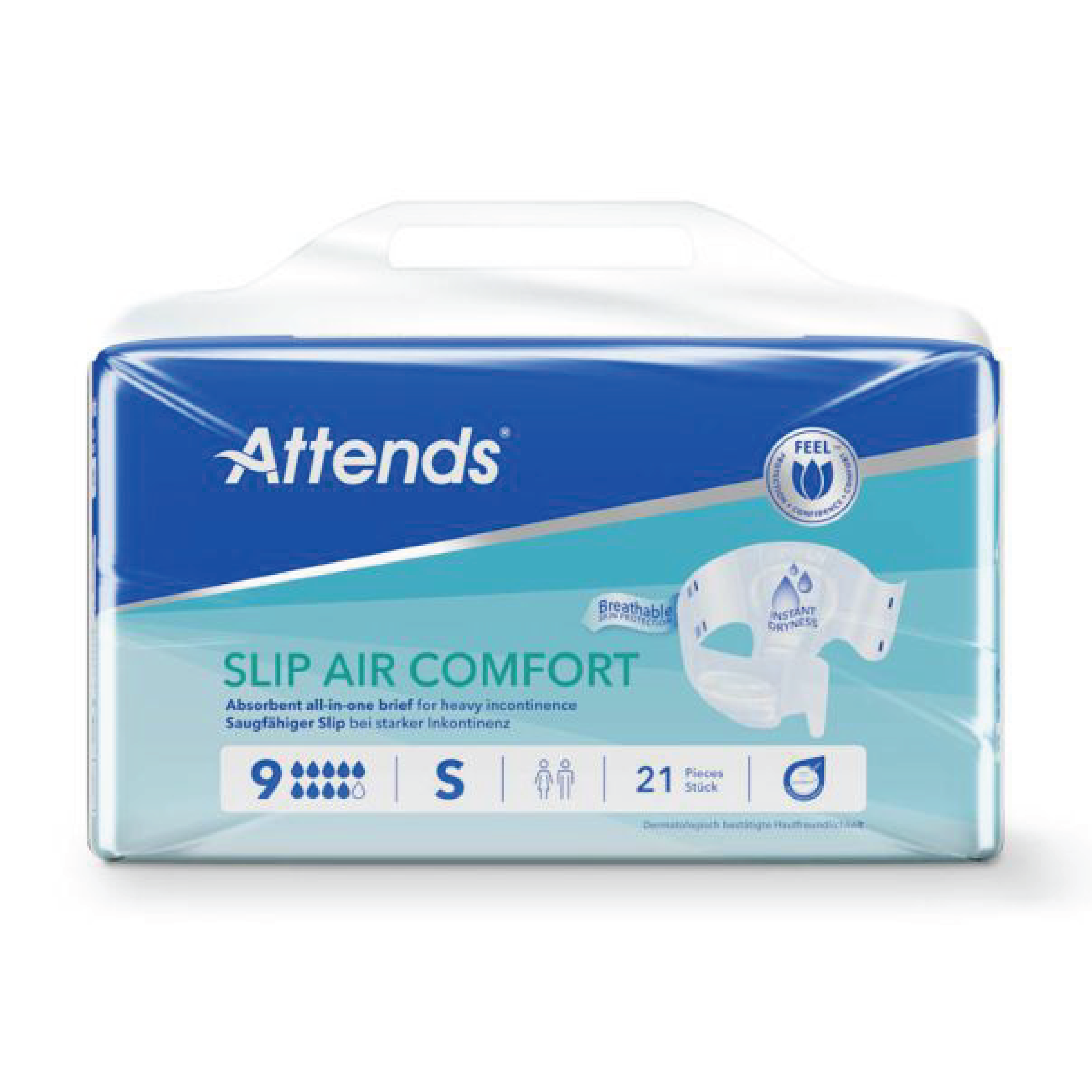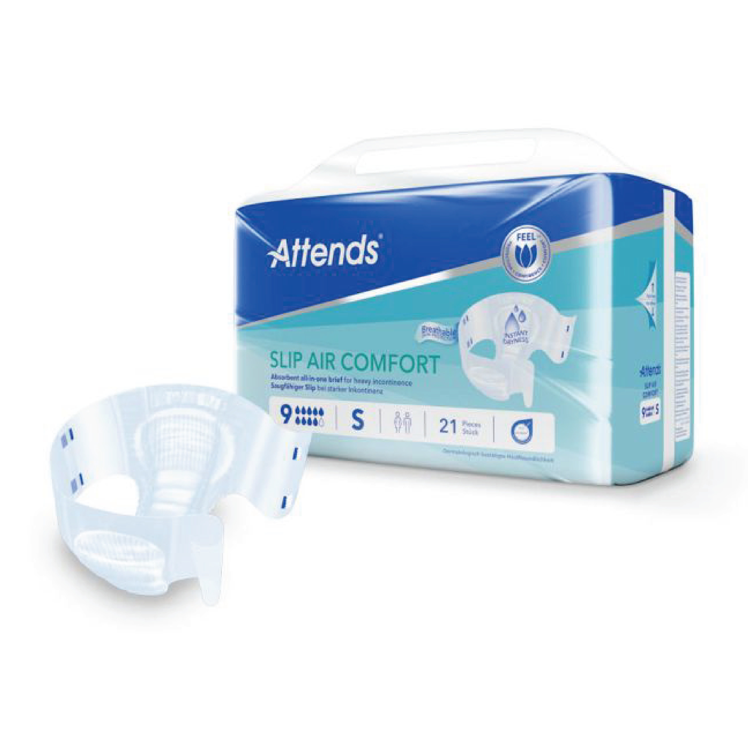 Attends Slip Air Comfort 9 er utstyrt med kanalteknologi som bidrar til rask fordeling av væske, trekker fuktighet bort fra huden og gir en tørrere overflate. Den pustende baksiden bidrar til å beskytte huden, mens elastisk midjebånd, benelastikker og anatomisk formet kjerne gir god passform og komfort. Produktet har et festesystem med fire gjenlukkbare teiper som gjør det enkelt å tilpasse bleien etter behov. Den superabsorberende kjernen med distribusjonslag og luktbeskyttelse bidrar til økt tørrhet og redusert risiko for ubehagelig lukt. Passer for kvinner og menn med liten eller ingen kontroll på blære- og/eller tarmfunksjon.