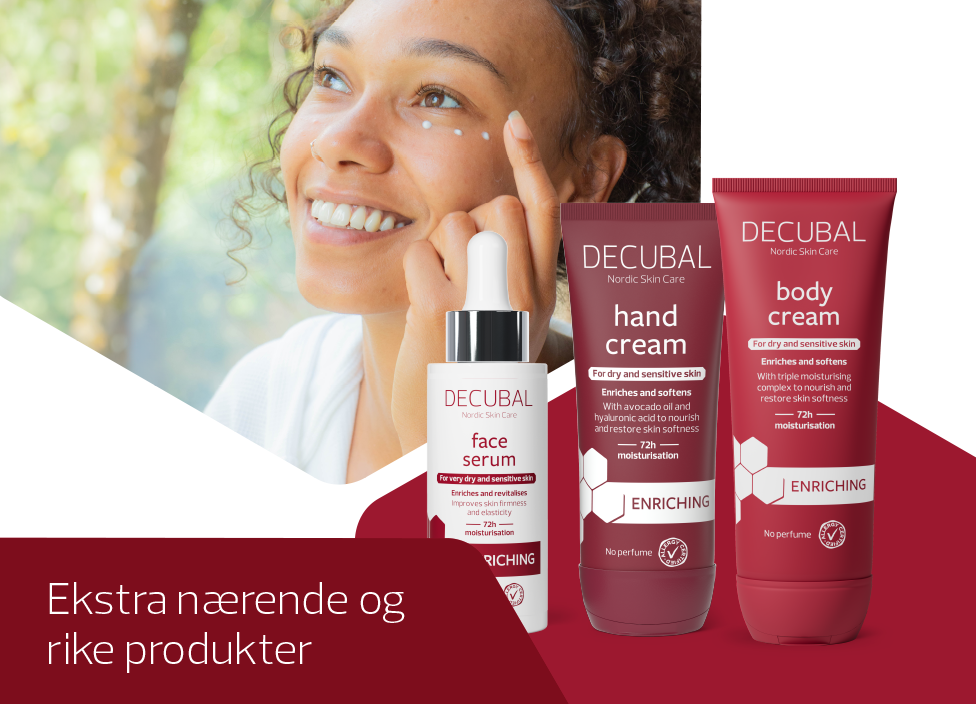 Decubal har i 50 år utviklet produkter som er spesielt tilpasset livet i Norden som er velegnet for hele familien. Decubal dekker hele kroppens behov med milde produkter for ansikt, kropp, hår og hodebunn. Alle produktene er utviklet i samarbeid med nordiske hudleger, og alle ingrediensene er nøye utvalgt med fokus på effektiv pleie av tørr og sensitiv hud. Alle Decubal-produktene er fri for parfyme og fargestoffer. Decubal fås kun på apotek, hvor du kan få råd og veiledning når det gjelder hvilke produkter som passer best til deg.