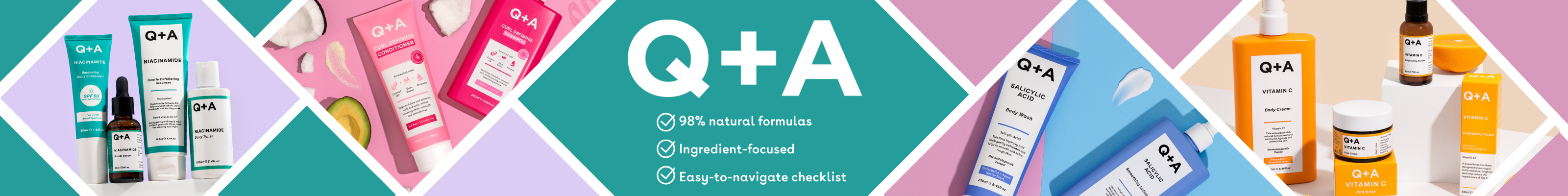 Q+A er et naturlig og ingrediensfokusert hudpleiemerke fra Storbrittania. Hudpleie kan for mange føles forvirrende, men Q+A gjør det enkelt å finne riktige produkter for ansikt og kropp. Dette ved hjelp av deres unike Q+A-sjekkliste som er trykt på alle produktene. Alle produktene er formulert med naturlige nøkkelingredienser som bidrar til å fremme en sunn hud.